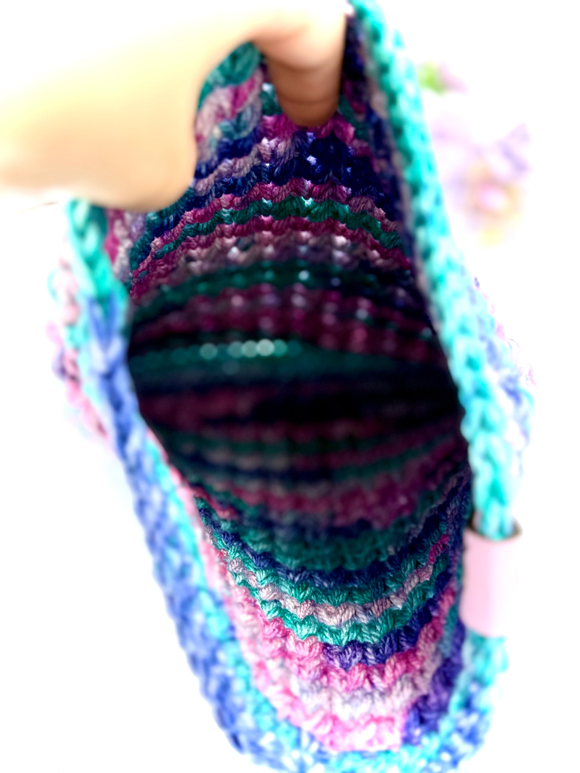 One handmade crochet turquoise, blue, pink, and white variegated (tie-dye like) large book sleeve with a wooden book stack button closure