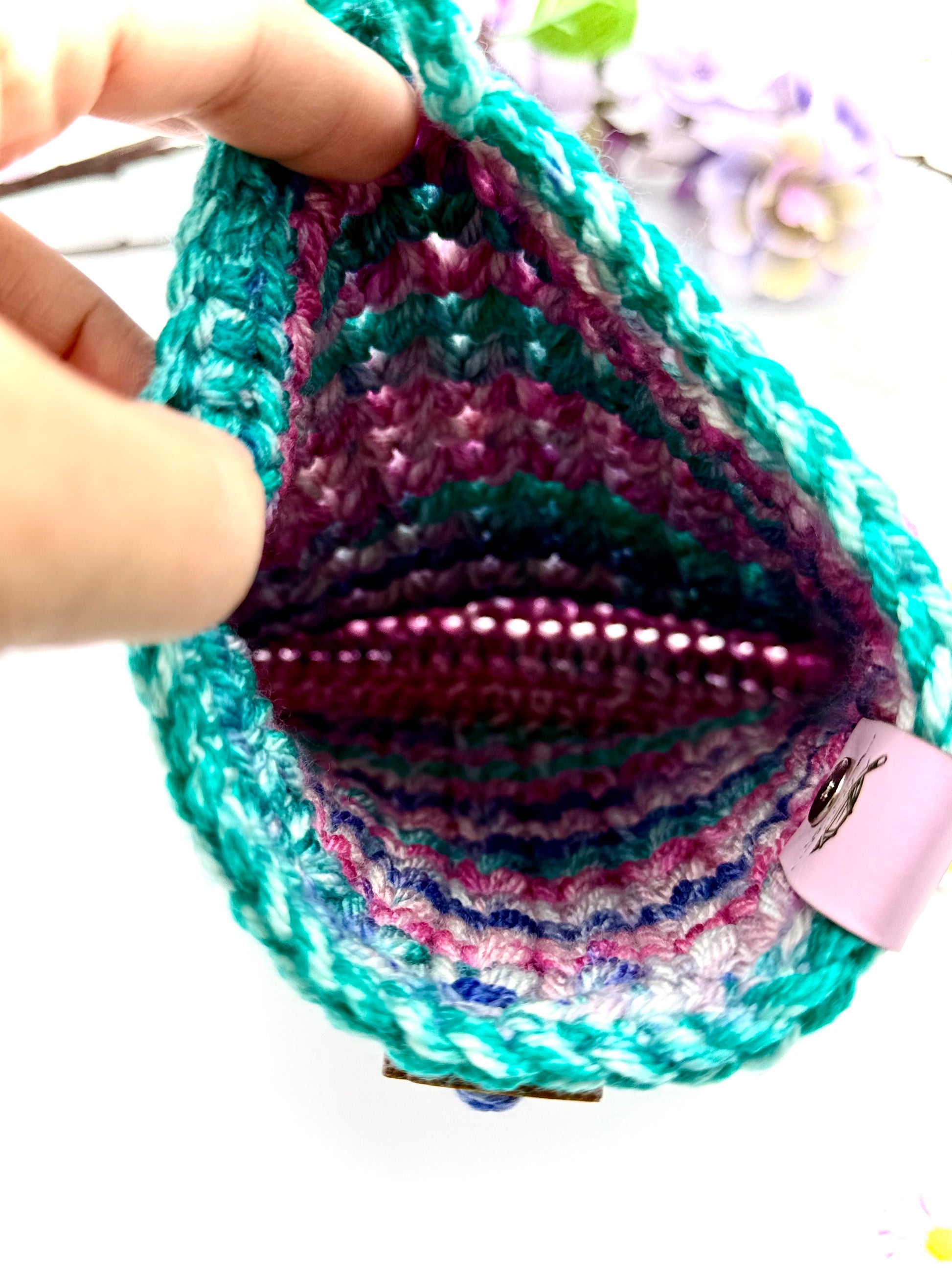 One handmade crochet turquoise, blue, pink, and white variegated (tie-dye like) small book sleeve with a wooden book stack button closure