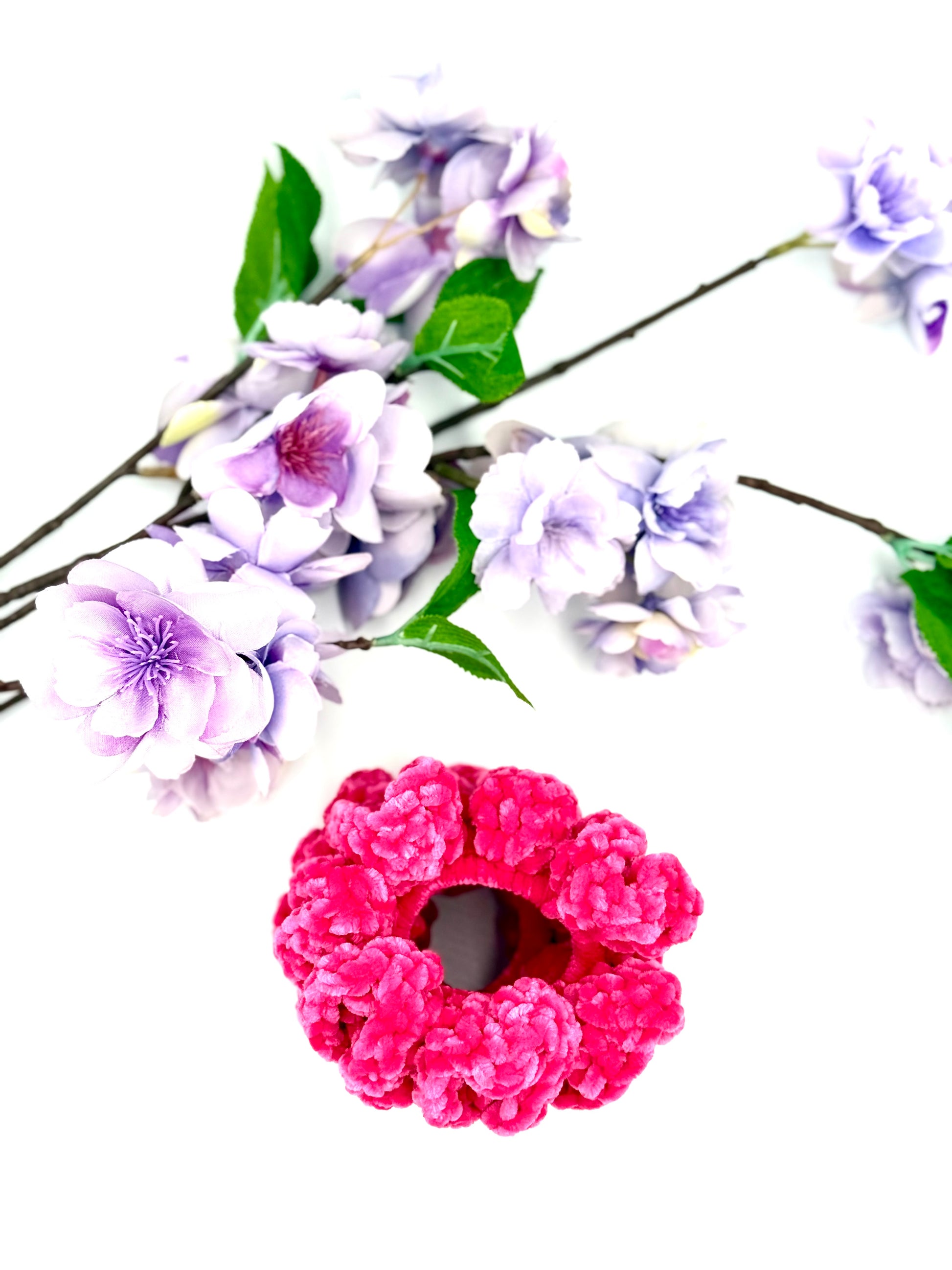 One handmade crochet velvety smooth neon pink scrunchie