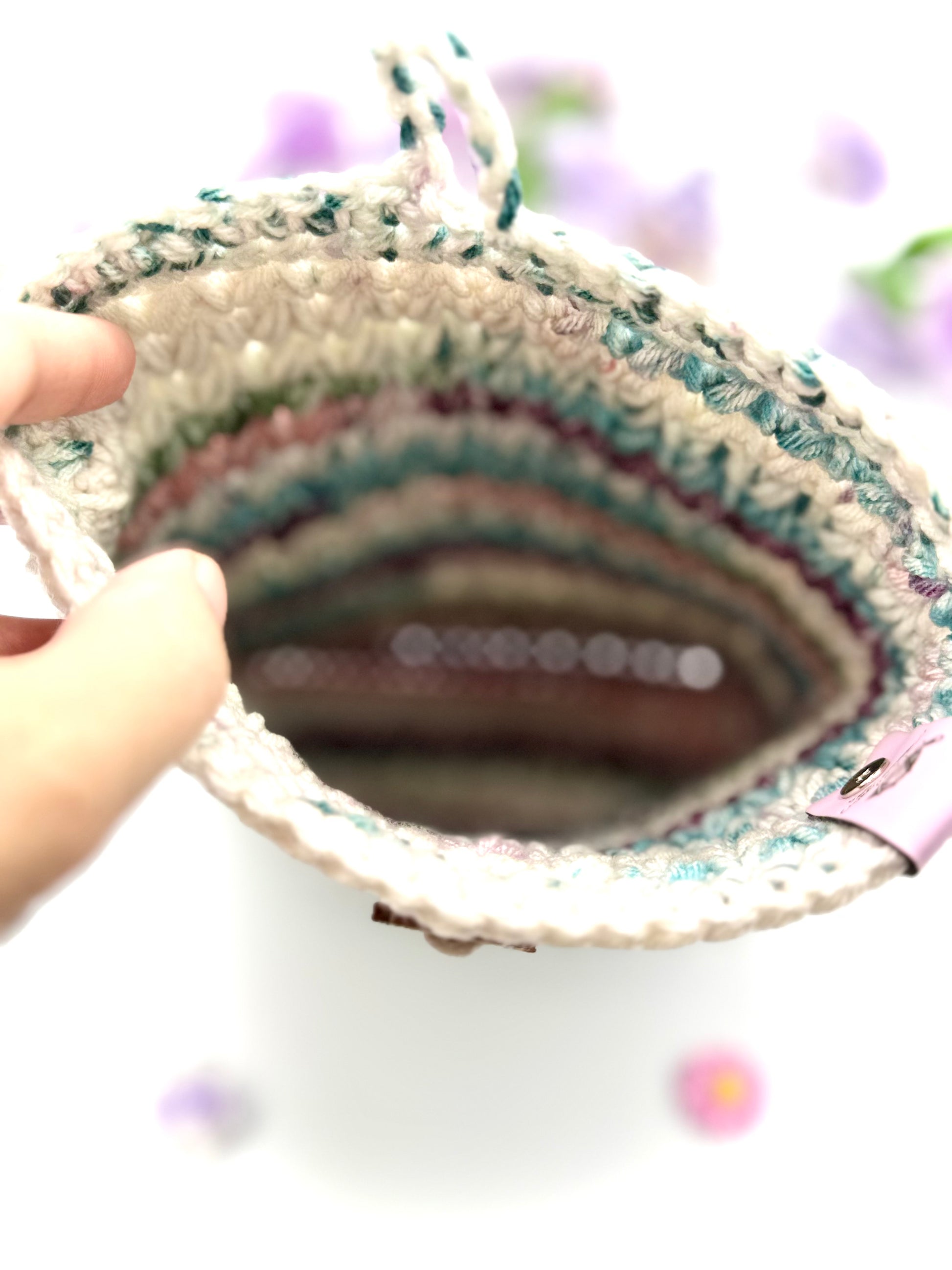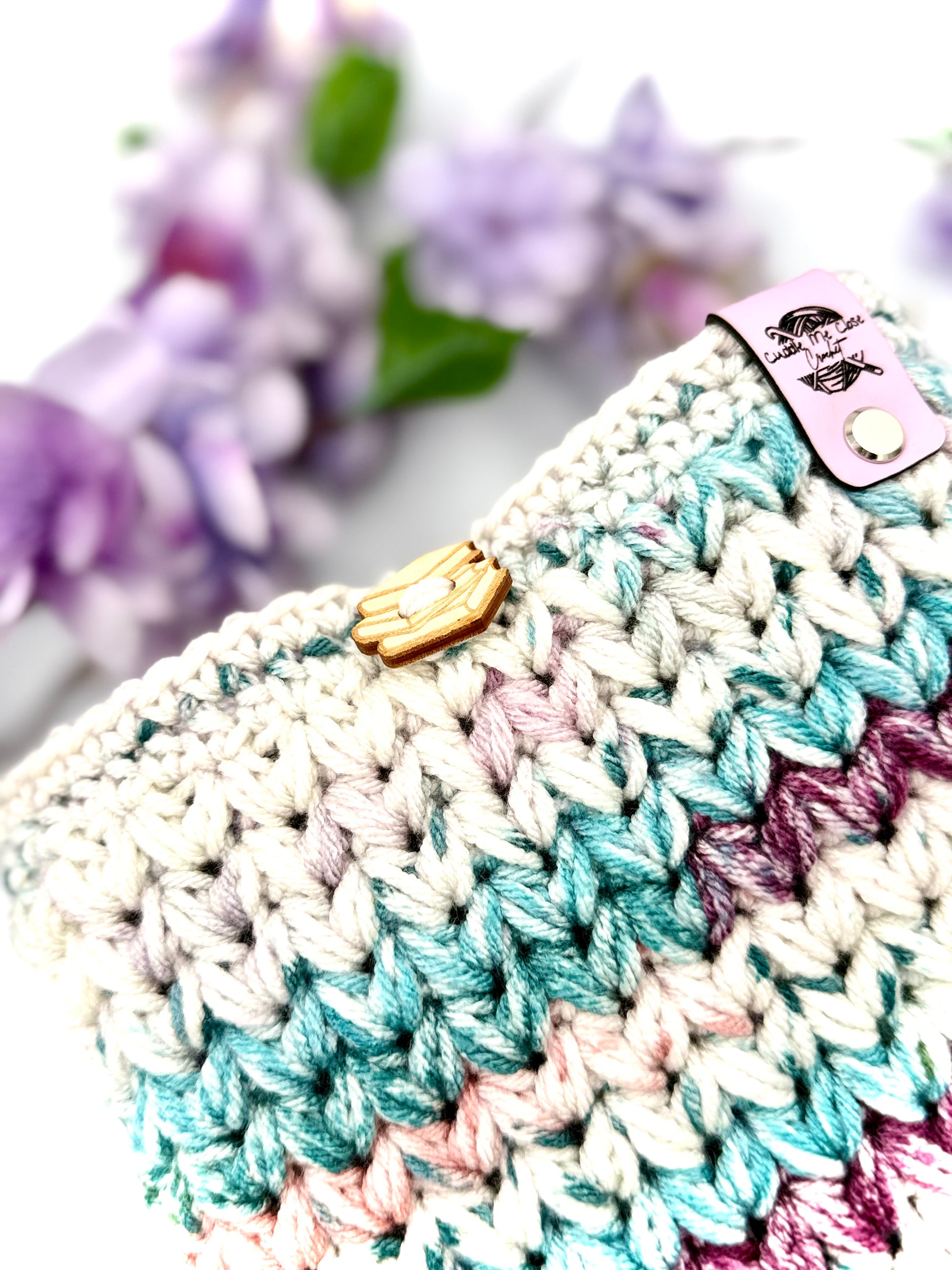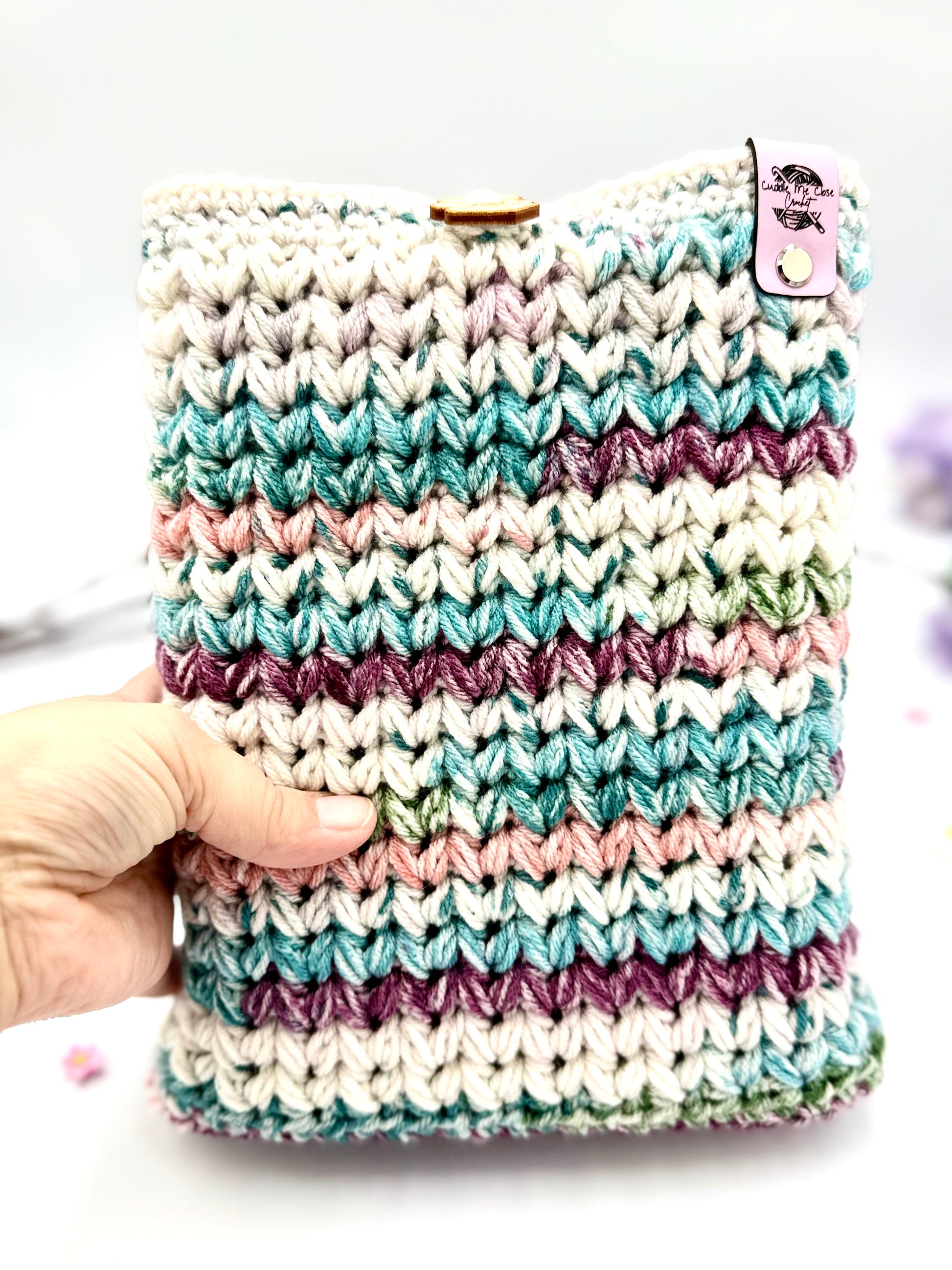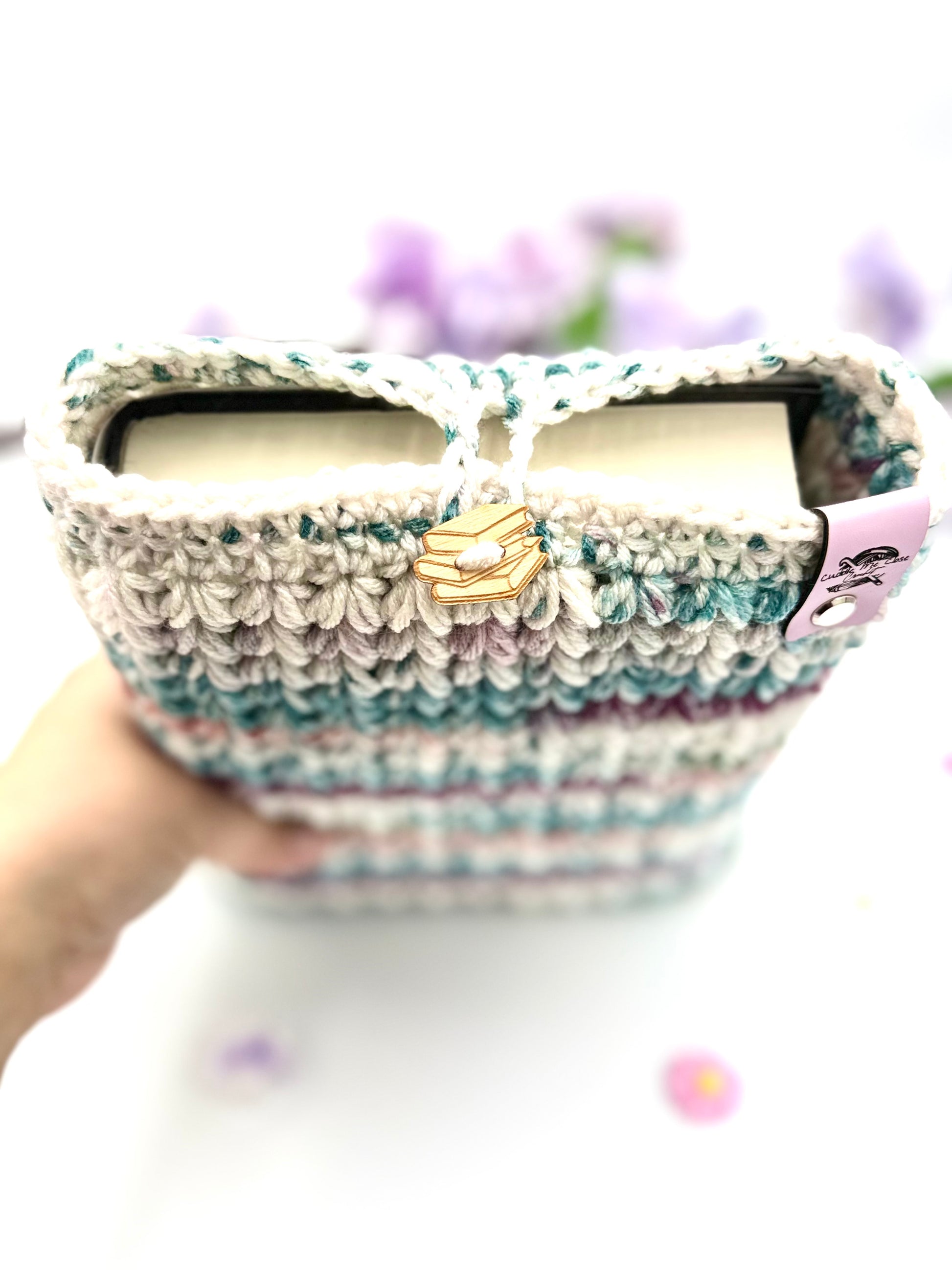One handmade crochet dark magenta, teal, green, and white variegated (tie-dye like) medium book sleeve with a wooden book stack button closure