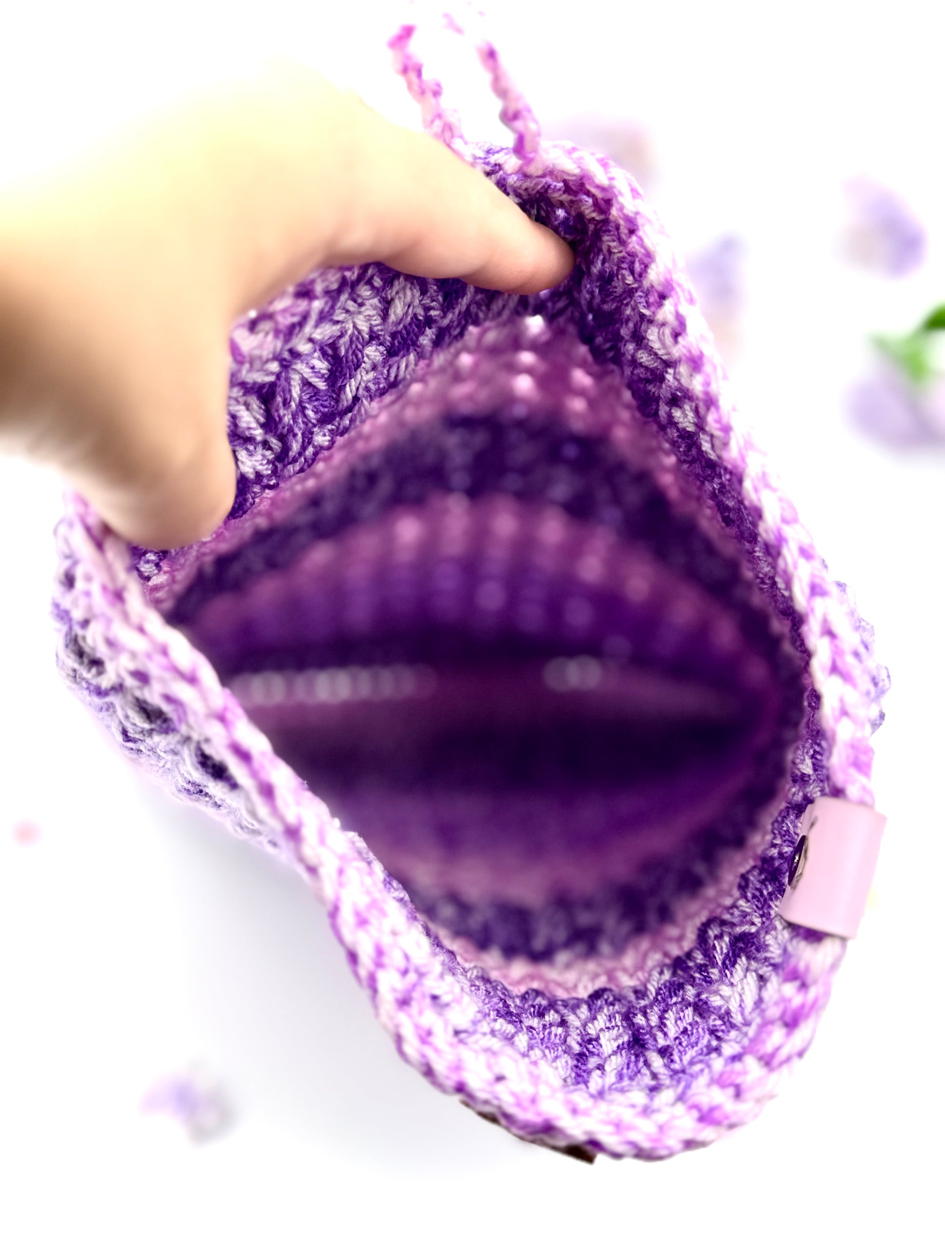 One handmade crochet violet, purple, and white variegated (tie-dye like) large book sleeve with a wooden book stack button closure